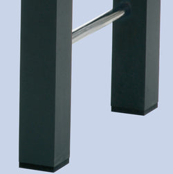 Le robuste gambe quadrate in MDF (cm. 9 x 9) con rivestimento melaminico color nero sono rese ancora più stabili dalle barre cromate di rinforzo (diametro mm. 38).